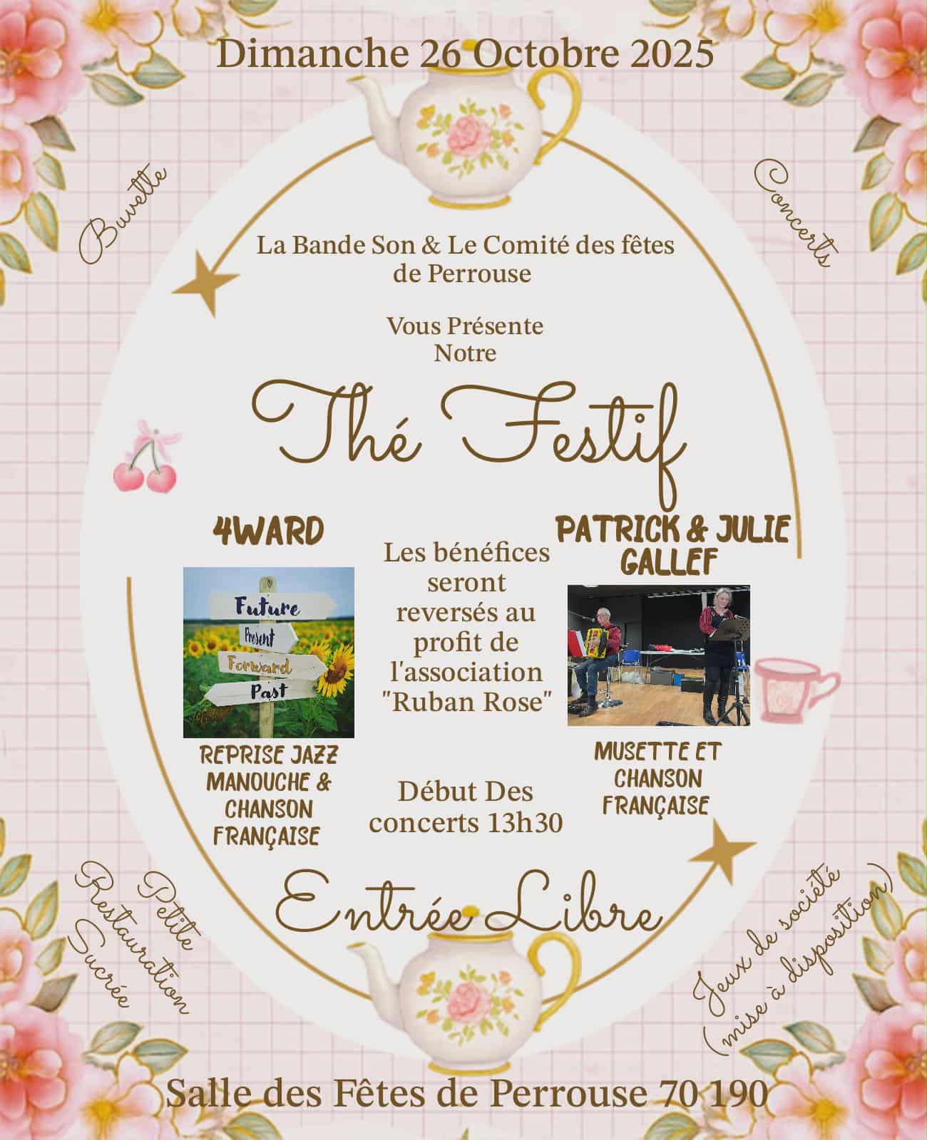 Dimanche 26 octobre dès 13h30 à la salle des fêtes de Perrouse, thé festif avec la bande son et le comité des fêtes de Perrouse. Entrée libre.