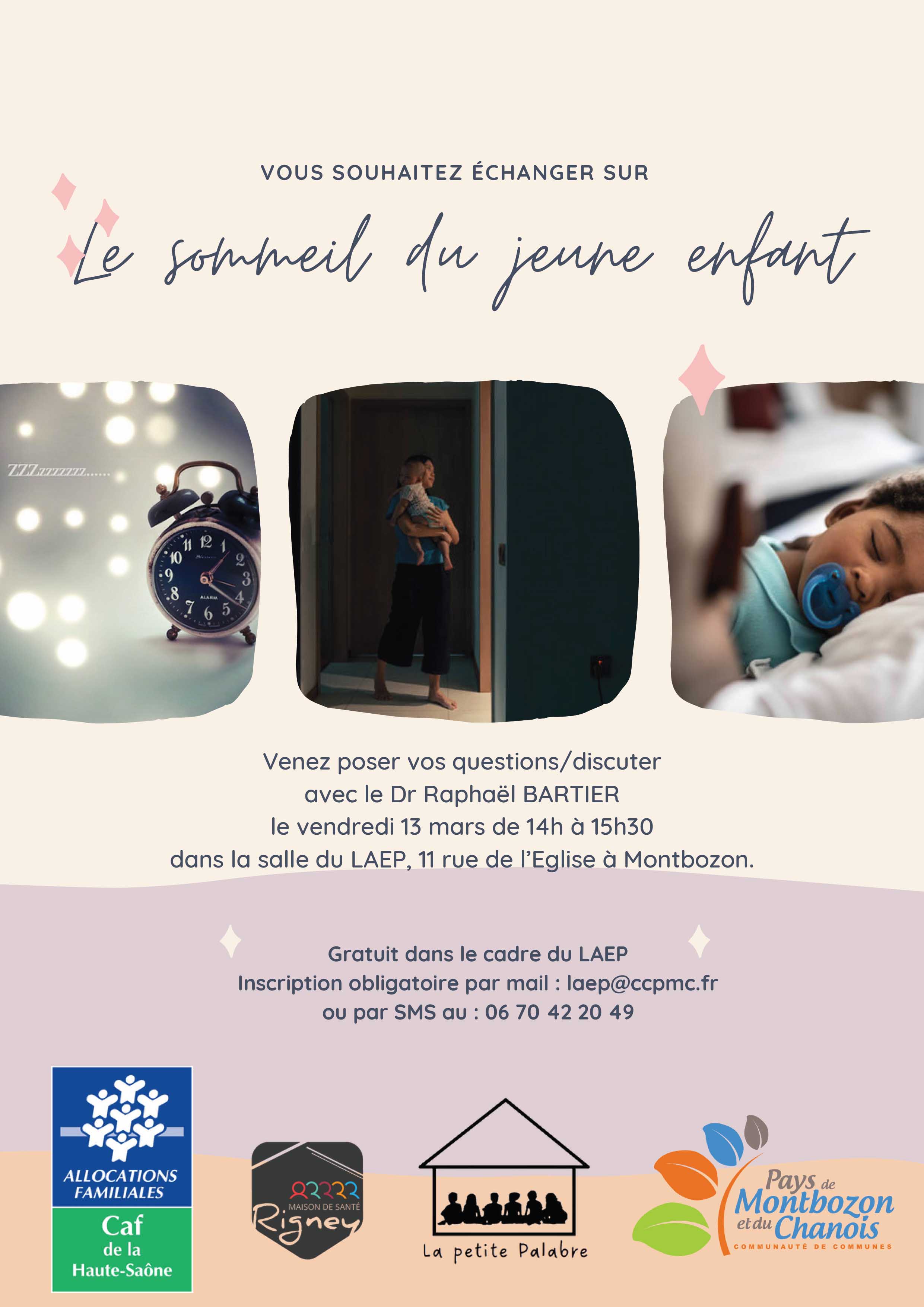 Atelier sur le sommeil du jeune enfant, venez poser vos questions gratuitement, le vendredi 13 mars de 14h à 15h30, inscription par mail : laep@ccpmc.fr ou par SMS au : 06 70 42 20 49