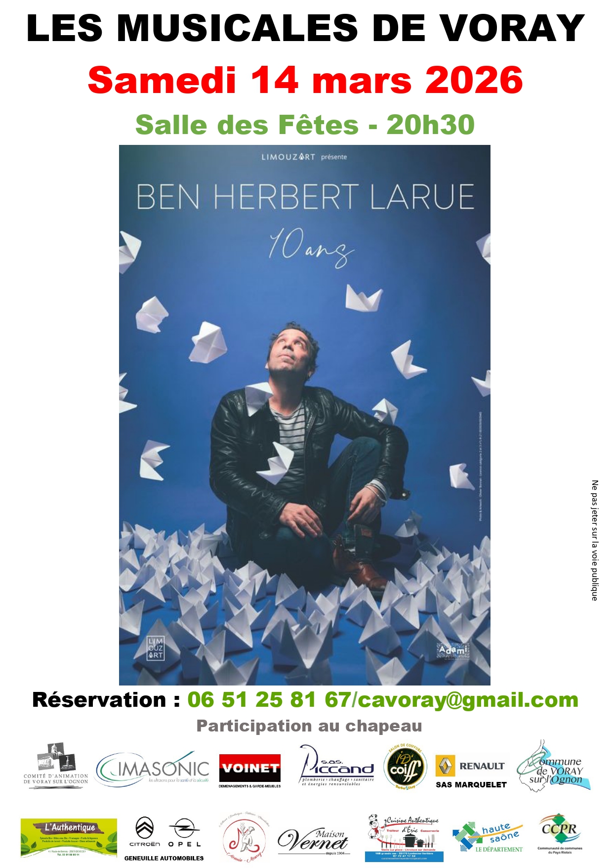 Samedi 14 mars à 20h30 à la salle des fêtes de Voray sur l'Ongon, concert de Ben Herbertt Larue. Participation libre. Réservation au 06 51 25 81 67 ou cavoray@gmail.com