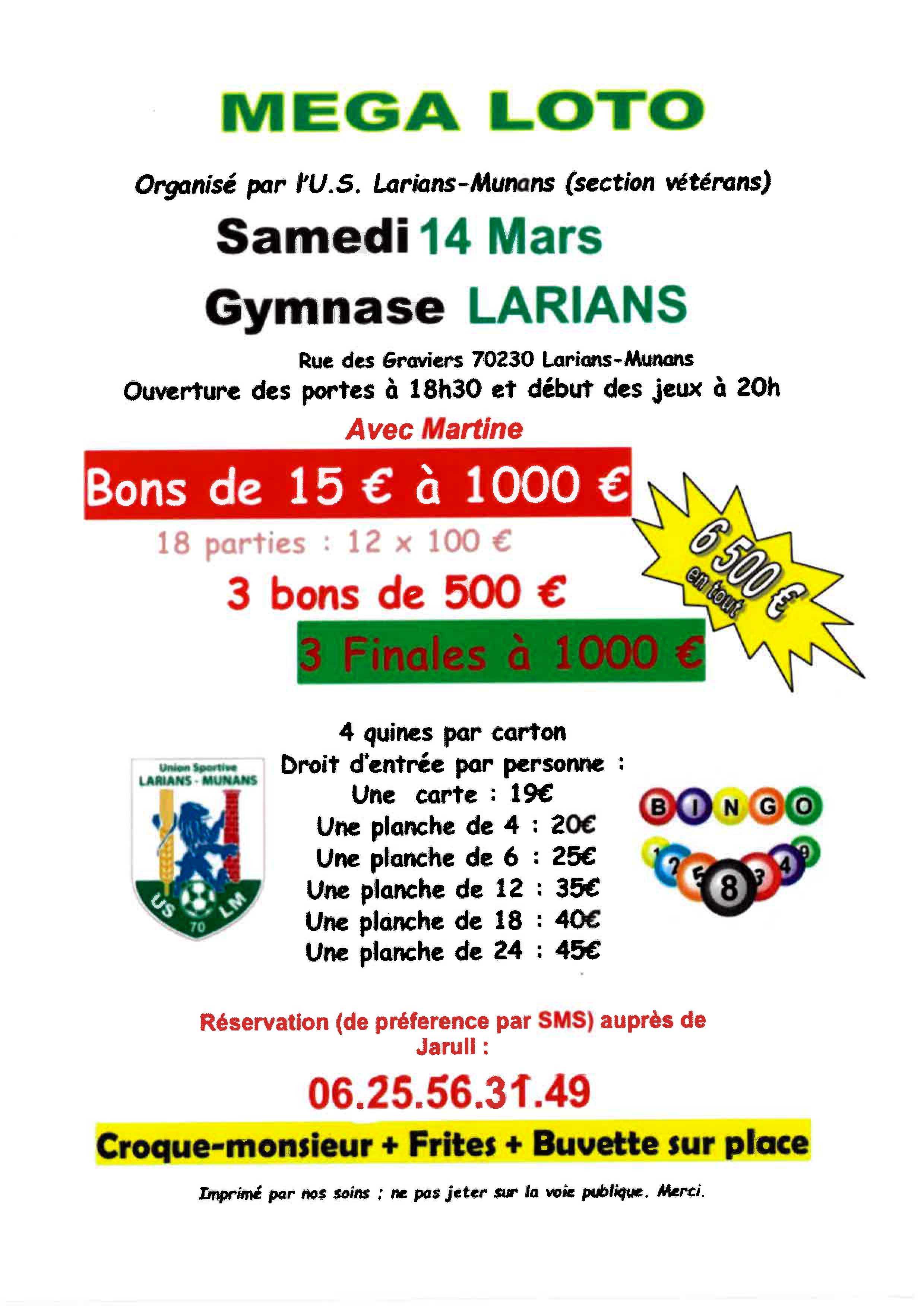 Samedi 14 mars, loto au gymnase de Larians, organisé per l'US Larians-Munans.Réservation par sms au 06 25 56 31 49.