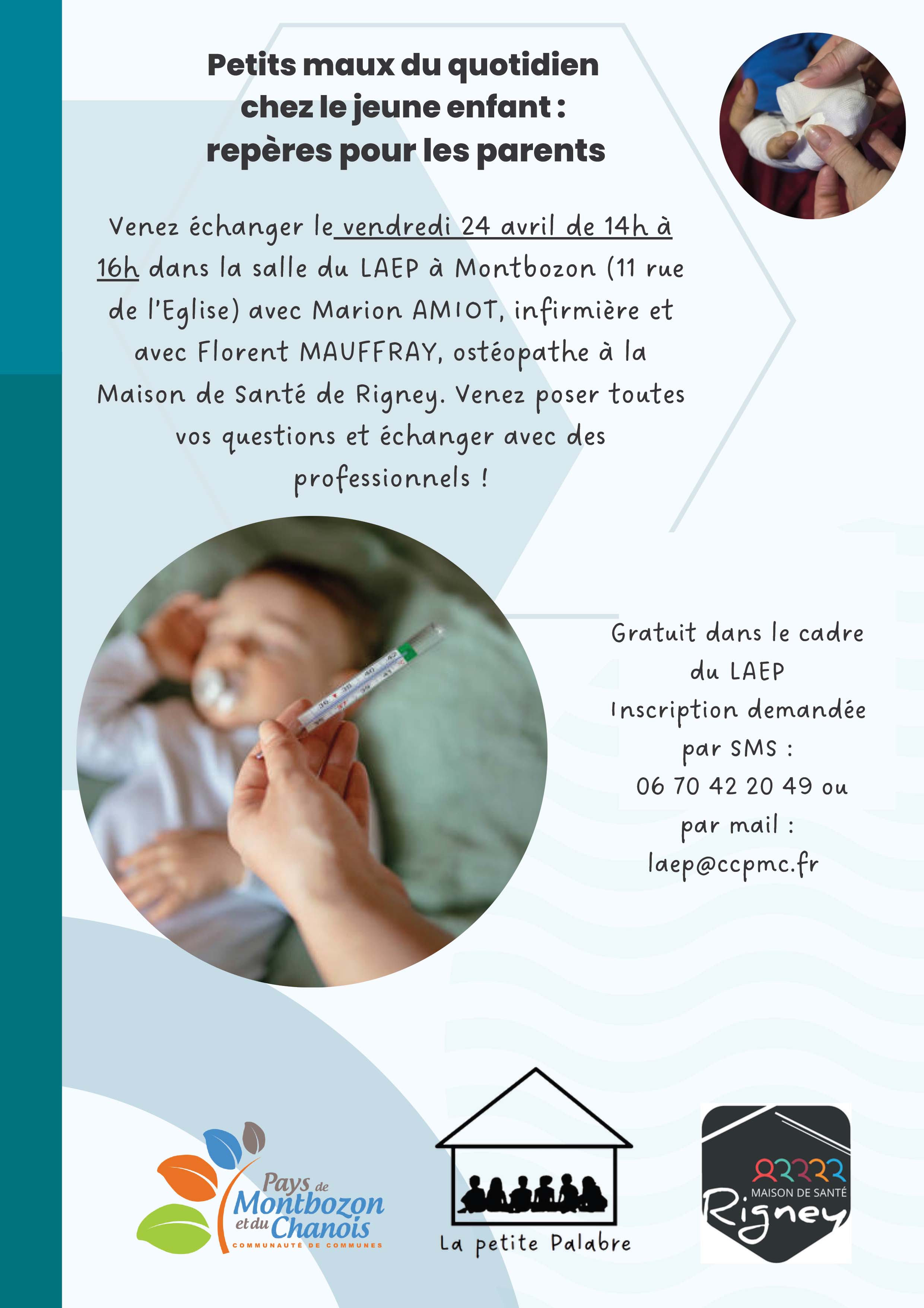 Vendredi 24 avril de 14h à 16h, atelier sur les "petits maux du quotidien chez le jeune enfant, repère pour les parents" dans le cadre du LAEP à Montbozon