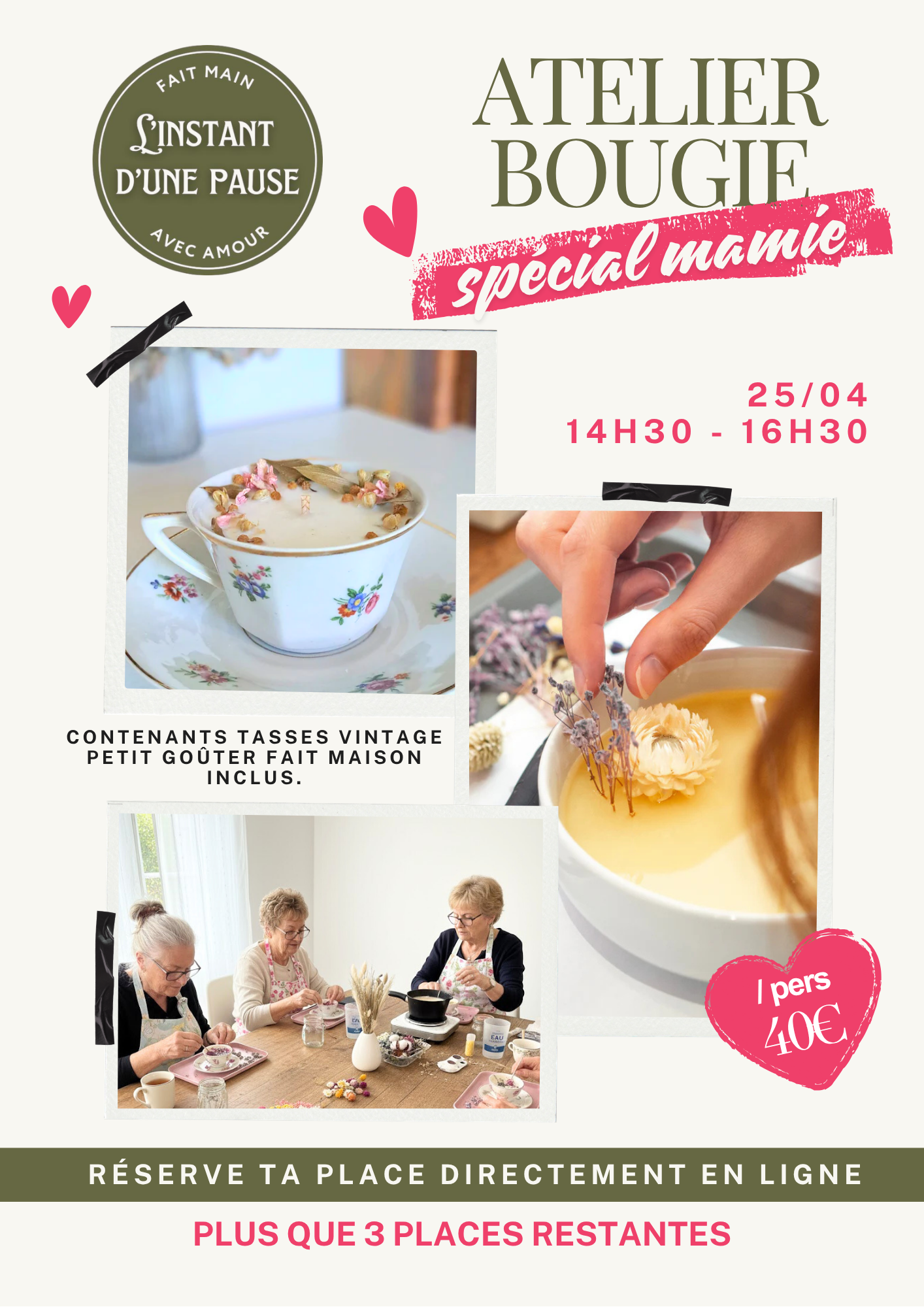 L'instant d'une pause vous propose un atelier bougie "spécial mamie" le samedi 25 avril de 14h30 à 16h30 à Rioz.