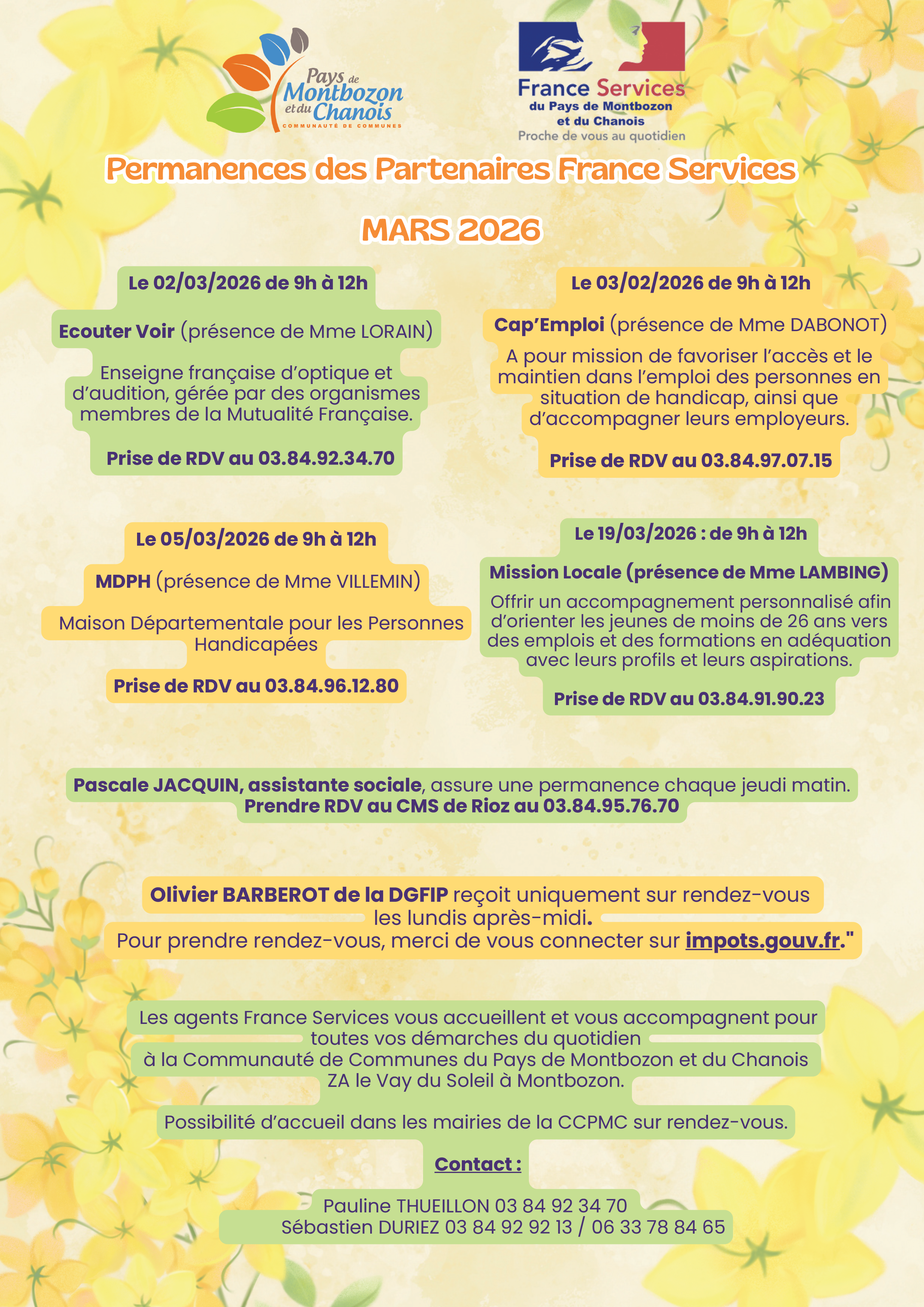 Permanences des Partenaires France services Mars 2026 de 9h à 12h.