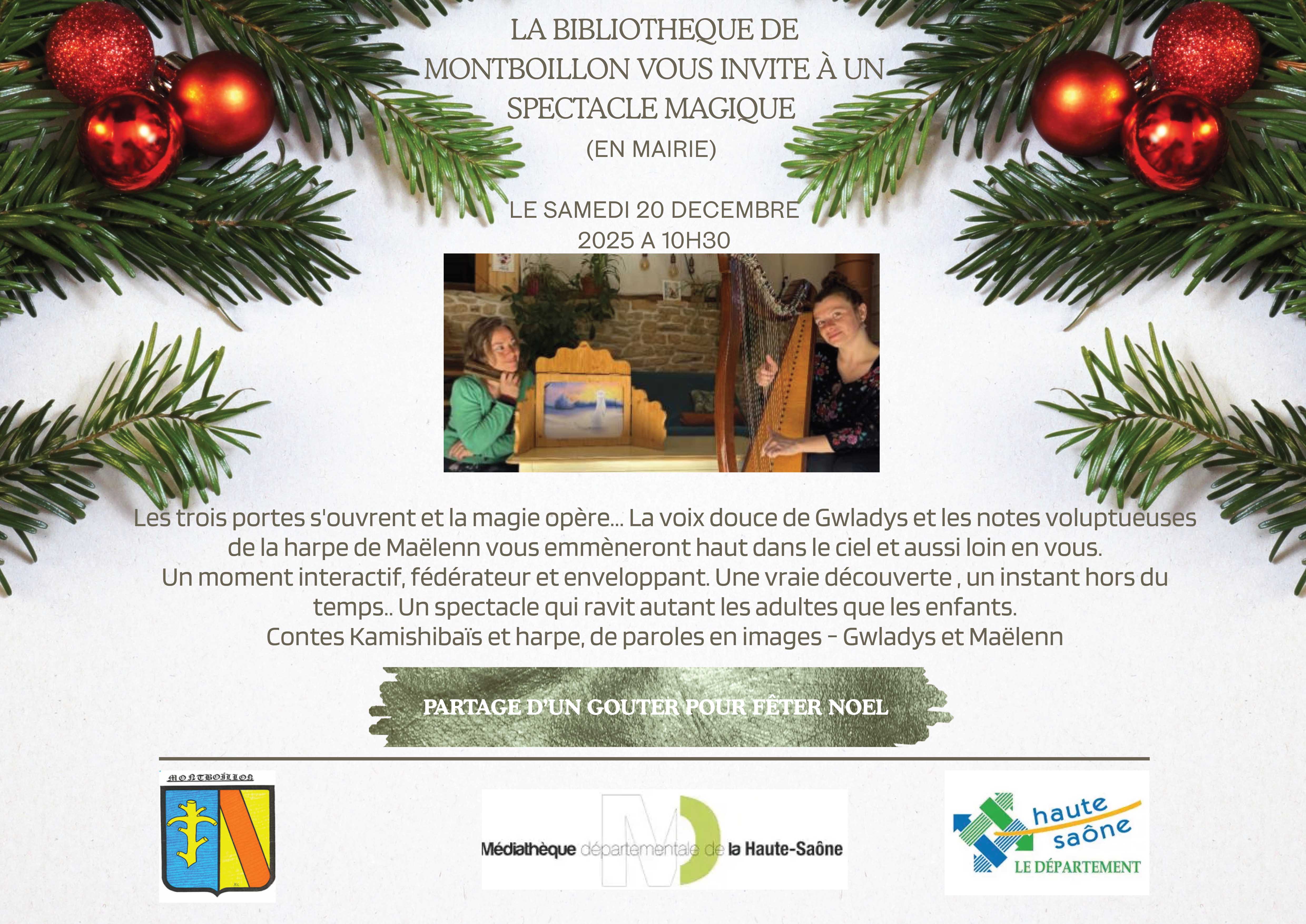 Le samedi 20 décembre, à la bibliothèque de Montboillon, rdv à 10h30 pour un spectacle magique avec de la harpe et du kamishibaïs, le duo de Gwladys et Maëlenn.