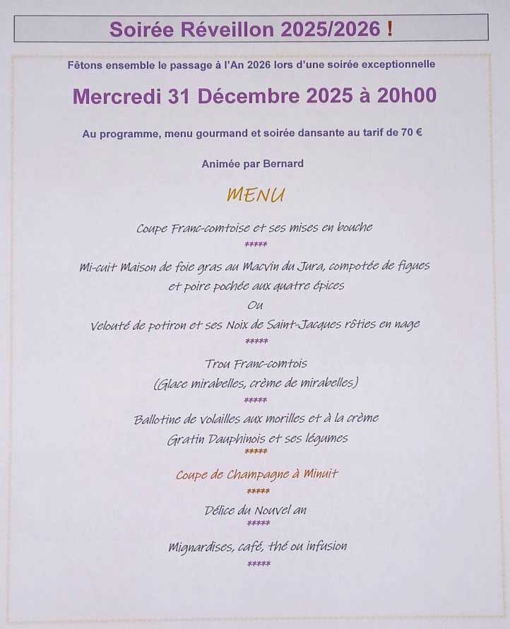 Réveillon de la Saint Sylvestre à Neuvelle les Cromary, 31 décembre à l'espace de la Charme. Places militées, infos au 03 84 91 93 79.